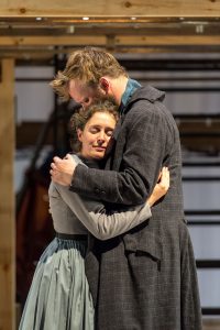 Das Wechseln von Kleidungsstücken geschieht während dem Stück, häufig mit musikalischer Begleitung; eine Praxis, die man infrage stellen könnte. Die Inszenierung geht fast gar nicht auf die Klassenunterschiede ein, die Teil der Romanvorlage sind. Dafür steht mehr Janes Leidensweg im Vordergrund. Insgesamt ist viel Bewegung auf der Bühne. Im hetzenden Gruppenlauf geht es von Station zu Station. Die meisten Schauspieler spielen mehrere Rollen, was es zusätzlich zum minimalistischen Setdesign manchmal schwierig macht, zu wissen, wen man jetzt gerade vor sich hat. Zusätzlich werden auch die inneren Stimmen von Jane an manchen Stellen externalisiert. Auch dies wird von anderen Schauspielern mitübernommen. Melanie Marshall singt eine Opernvariante von „Crazy“ (Gnarls Barkley). Ihre Rolle ist von vornherein sehr unklar. Sie wird immer von der Band begleitet, hält sich aber nicht dezent im Hintergrund, sondern fällt bereits durch ihr rotes Kleid sehr auf. Erst gegen Ende wird klar, wer sie ist. Während die Chemie zwischen Rochester und Jane zum Ende der ersten Hälfte noch nicht wirklich zu sehen sehen ist, punkt die zweite Hälfte mit einem fantastisch-lustigen Heiratsantrag in „Romeo-und-Julia“-Manier. Die Geschichte nimmt in der zweiten Hälfte dann nochmal richtig Fahrt auf.