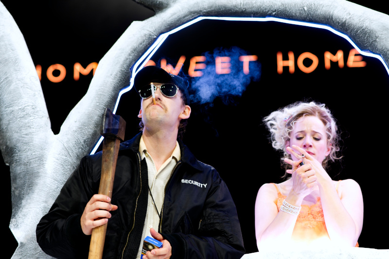 Ich bin der 30%-Rabatt-Aktion an Pfingsten vom Münchner Volkstheater verfallen. Denn ohne die hätte ich nicht spontan DER BESUCH DER ALTEN DAME gesehen. Regisseurin Sapir Heller hat sich Dürrenmatts Klassiker vorgenommen und dreht die Geschichte zwei Generationen weiter. Die Enkelin von Claire Zachanassian (Nina Steils) kommt für einen Auftritt nach Güllen, der verarmten Heimatstadt ihrer Großmutter. Da sie sich mit deren Vergangenheit nie richtig auseinandergesetzt hat, ist sie gespannt, Güllen endlich kennenzulernen. Der Klang ihres Nachnamens bringt die ganze Stadt auf die Beine. Man erhofft sich eine Finanzspritze durch die Erbin der reichen Dame. Doch schnell merkt Zachanassian, dass noch etwas anderes mitschwingt. Die Güllener sind allesamt Nachgeborene und kennen die alte Dame nur aus Erzählungen. Erst nach und nach erfährt die Enkelin, dass Alfred Ill, nachdem er ihre Großmutter geschwängert hat, die Vaterschaft abstritt und die Schwangere ins Ausland fliehen musste. Claire wird klar, dass die ganze Stadt daran eine Mitschuld trägt, die nicht aufgearbeitet wurde. Da die Güllener das ganz anders sehen – alles Schnee von gestern, sowas könne heute nicht mehr passieren – setzt sie ein üppiges Kopfgeld auf Alfred Ills Enkel (Jonathan Müller) aus.