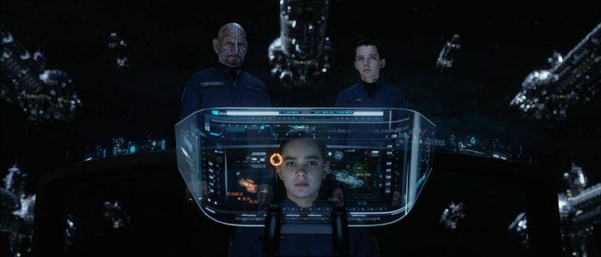 Handwerklich ist ENDER’S GAME nicht besser oder schlechter als andere Teenie-Dystopien. Die Handlung ist dementsprechend trivial. Es muss mal wieder ein Kind die Menschheit retten. Das allein ist noch nicht besonders. Interessant wird es allerdings, wenn man fragt, welche Ideologie der Film vertritt. Da tun sich die wahren Abgründe auf. Den ganzen Film durchzieht ein militärischer Unterton. Die Figuren, mit denen Ender interagiert, sind meistens Rekruten, Ausbilder und höherrangige Militärangehörige. Die Spiele sind Mittel zum Zweck, als kindgerechte Übung des Krieges. Man könnte auch am Ende von einer Verharmlosung des Krieges sprechen. Diese große Schlusspointe, nämlich, dass das Militär einem Kind ihre komplette Kriegsflotte anvertraut, erscheint da nur die innerdiegetisch logische Konsequenz. Abgesehen davon halte ich das aber eine schwierige Botschaft, besonders für das junge Zielpublikum. Im Grunde ist die Geschichte die eines Kindersoldaten. Da kann auch die computerspielhafte Optik wenig darüber hinwegtäuschen.