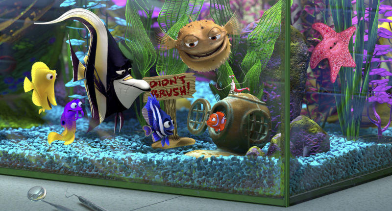 Auch Pixars fünfter Spielfilm führte den Erfolg des erfolgsverwöhnten Animationsstudios fort. Die Geschichte folgt dem kleinen Clownfisch Nemo (Stimme von Domenic Redl), der zusammen mit seinem Vater Marlin (Christian Tramitz) in einem wunderschönen Riff wohnt. Seine Mutter Cora und alle Geschwister wurden vor seiner Geburt von einem Barracuda gefressen. Von diesem Trauma hat sich Marlin nie ganz erholt und hütet sein einziges Kind wie seinen Augapfel. Nemo hat auch eine schwache rechte Flosse, durch die er nicht so schnell schwimmen kann. An Nemos erstem Schultag werden Marlins schlimmste Befürchtungen Realität. Sein Sohn wird von einem Taucher gefangen genommen. Mutig macht er sich auf die Suche nach Nemo und trifft dabei auf andere Meeresbewohner wie die unter Amnesie leidende Dorie (Anke Engelke), die zwei vegetarischen Haie Hammer und Hart und die Meeresschildkröte Crush. Nemo hat währenddessen sein neues Zuhause erreicht. In der Praxis eines Zahnarztes ist er in einem Aquarium gelandet, wo er Freundschaft mit den anderen Fischen schließt. Bald erfährt Nemo, dass er als Geschenk für die Nichte des Zahnarztes, eine nachgewiesene Fischmörderin, gedacht ist. Verzweifelt versuchen die Aquariumsbewohner Nemo vor der bösen Darla zu retten. Der erste Fluchtversuch scheitert. Nemo entgeht nur knapp dem Tod.
