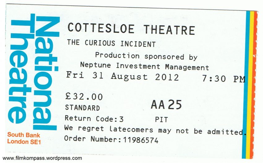 Ich… das ist ein Wort mit dem ich nie eine Filmkritik beginnen würde. Ich wähle nie die Ich-Form. Ich kleide meine subjektive Meinung in möglichst objektive hübsche Worte, die hoffentlich da draußen irgendwem etwas über das Gesehene verraten. Ich verwende unpersönliche und sachliche Formulierungen wie „man sieht“ oder „die schauspielerische Leistung überzeugt“, auch wenn meine Dozentinnen des Seminars „Filmkritik“ das so gar nicht mögen, weil man so den eigenen Sehvorgang nicht reflektieren kann. Aber heute muss ich eine Ausnahme machen, denn dieses Mal ist es tatsächlich persönlich. Es geht um den 31. August 2012 und den 05. Juni 2014. Zwischen beiden Terminen gibt es Verbindungen. An beiden Abenden verließ ich einen Veranstaltungsort – 2012 war es das National Theatre in London, 2014 das Cinestar in Weimar. Und in beiden Fällen hatte ich ein Grinsen auf dem Gesicht und ein wohliges „Die-Welt-ist-in-Ordnung-Gefühl“ im Bauch . Der Grund war der Gleiche: The curious incident of the dog in the night-time.